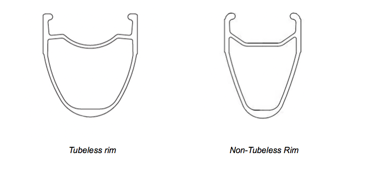Below are two examples of road bicycle rims. One is a tubeless compatible rim profile and one is not. The tubeless rim, on the left, has the characteristic ‘lipped well’ in the centre, which has two functions: the first is to make tyre fitting easier by effectively reducing the diameter of the rim while you’re fitting the tyre, and the second is to help encourage the tyre bead to stay at the edges of the rim during inflation/deflation instead of returning to the middle.