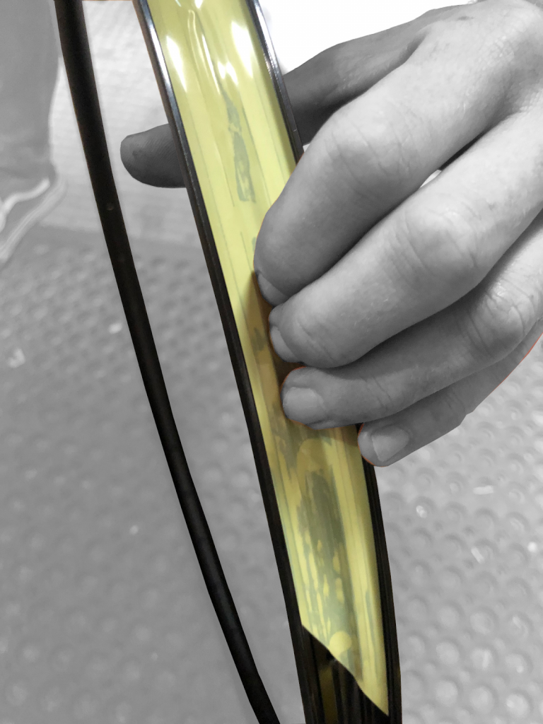The tubelessspares.com reliable method; first, clean the rim and dry it with a towel or rag. The tape needs to stick well, and be wide enough to be ‘pinned down’ by the tyre. Then, standing over the wheel, hold it to the floor, between your legs. You can use your feet to help hold it secure. Starting with the valve hole positioned at the floor, unroll a few cm of tape from the roll and start applying the tape opposite the valve, as this helps you check your progress. Press the first few cm of tape onto the rim to ensure adhesion, ensuring it fits tightly into the entire surface and minimise the risk of bubbles (see picture).